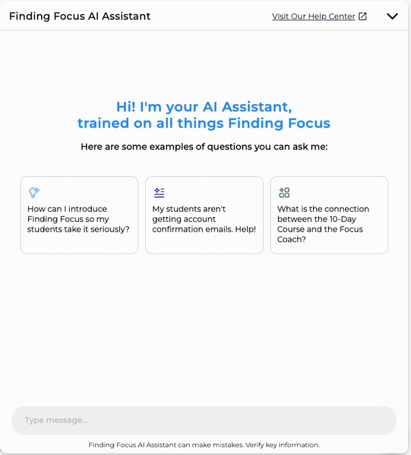 Question tiles give teachers a clear starting point — and signal what the assistant is actually capable of from the moment it opens.