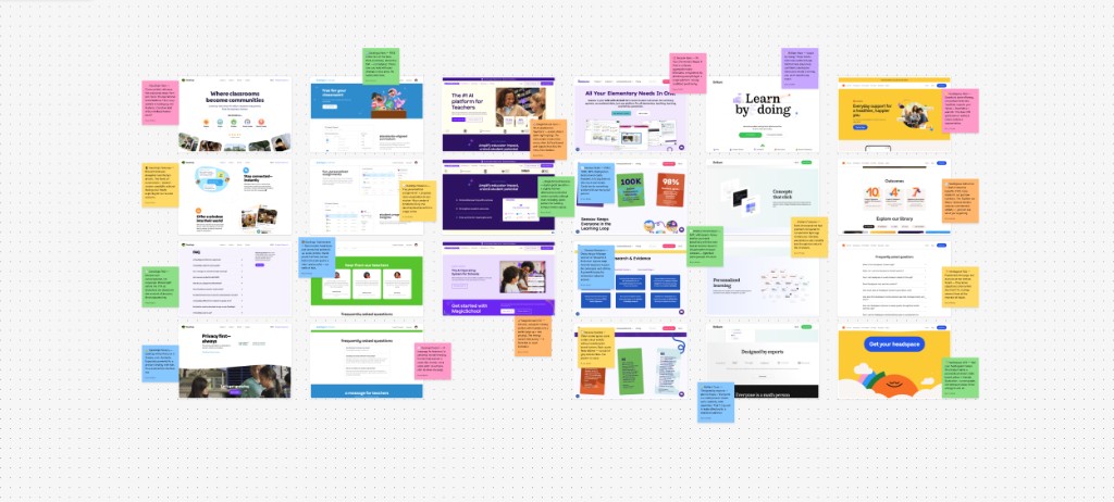 Competitive audit of edtech landing pages — screenshots and sticky-note notes from FigJam file I created