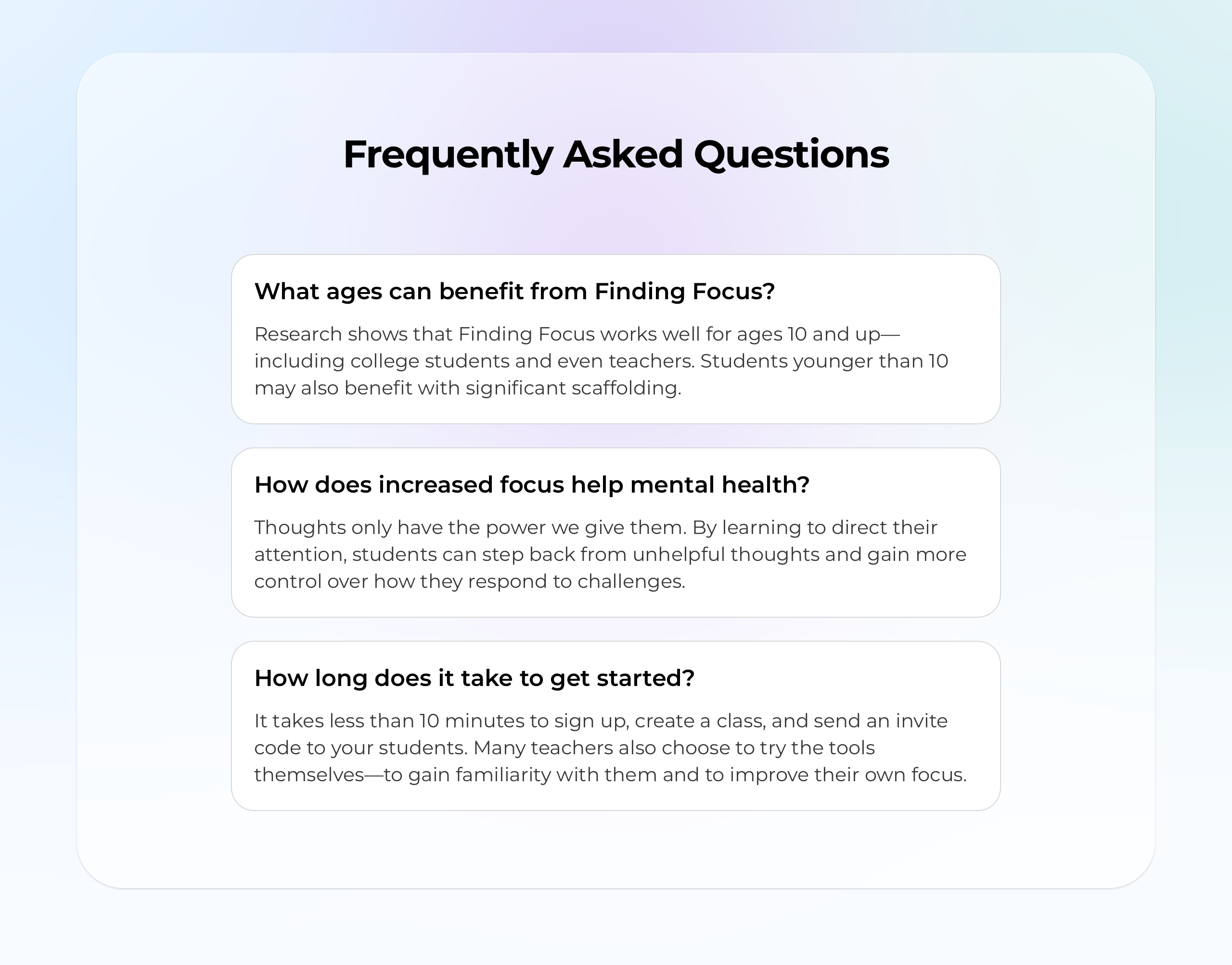 Talking with my co-founder, we decided on a few ideas that were important to clarify and get across to our audience. The FAQ section helped us answer practical questions around who Finding Focus is for, why it matters, and how easy it is to get started — all of which helps reduce hesitation before signing up.