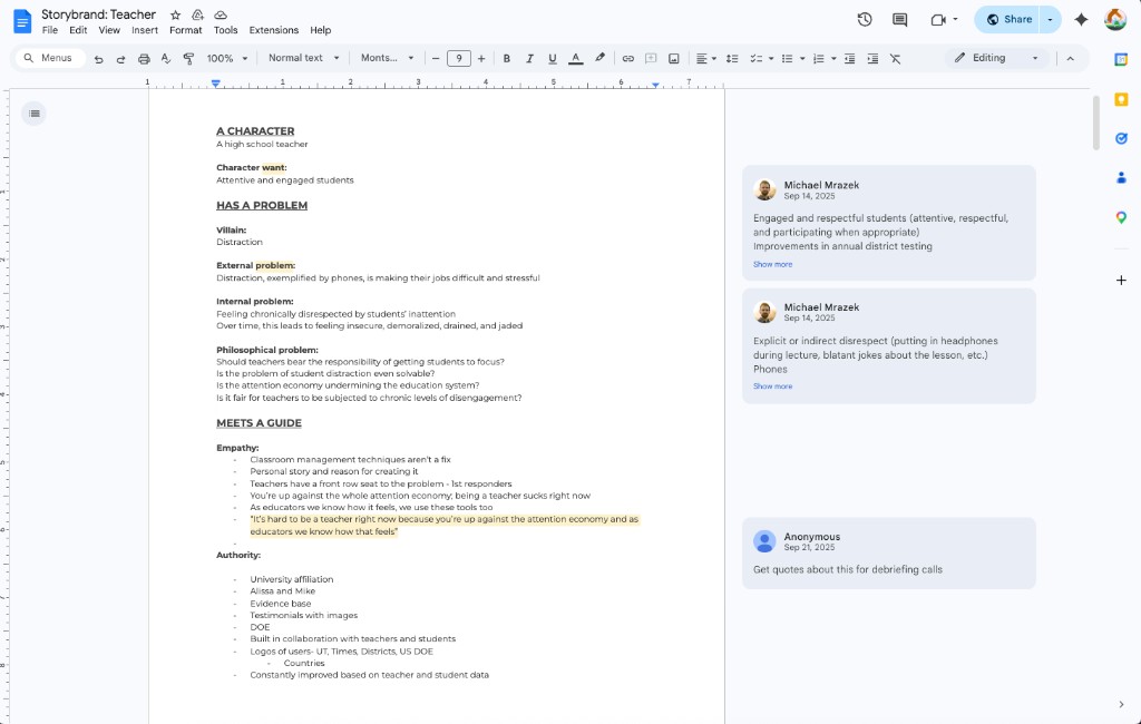 Google Doc we used to map out the teacher's narrative