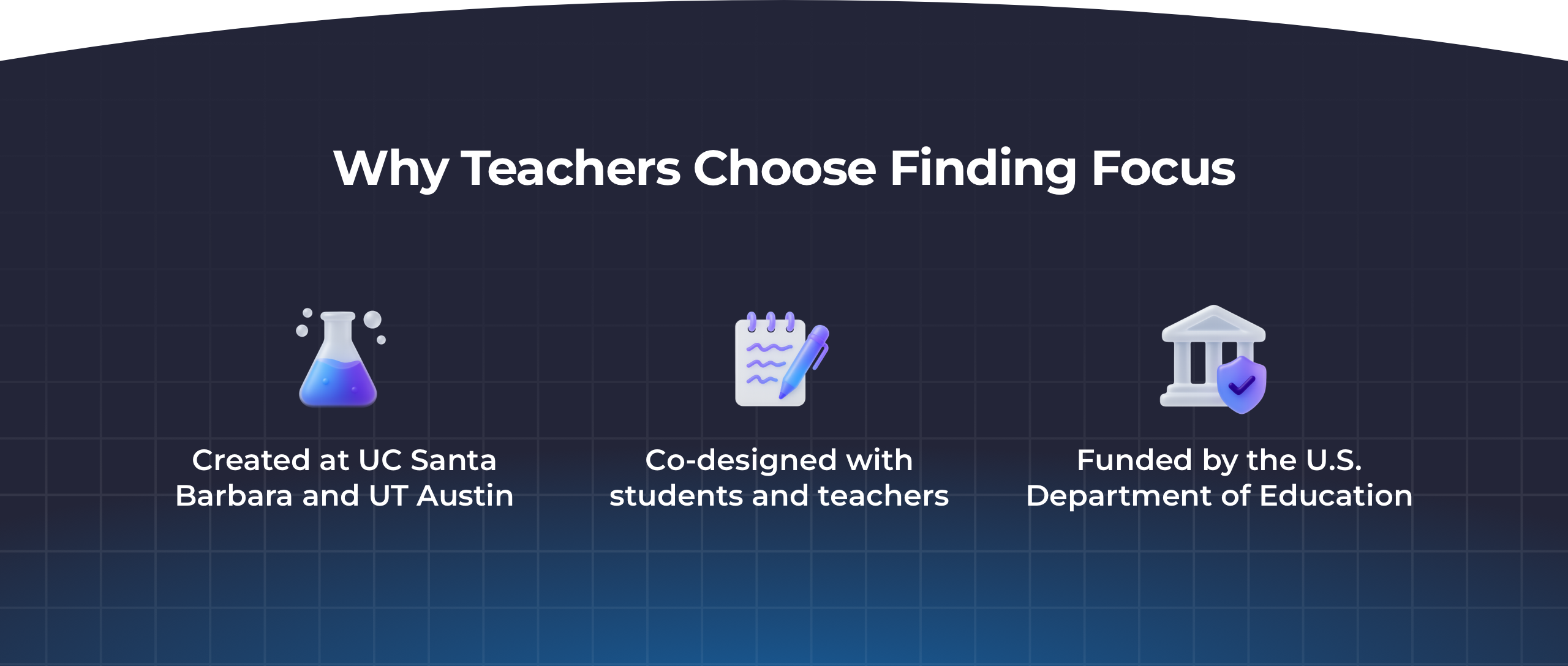 I placed credibility signals directly below the hero so teachers could quickly see Finding Focus's legitimacy. By mentioning the university backing, educator involvement, and US DOE funding - the page is able to build trust early instead of making users question the legitimacy or search for it later.