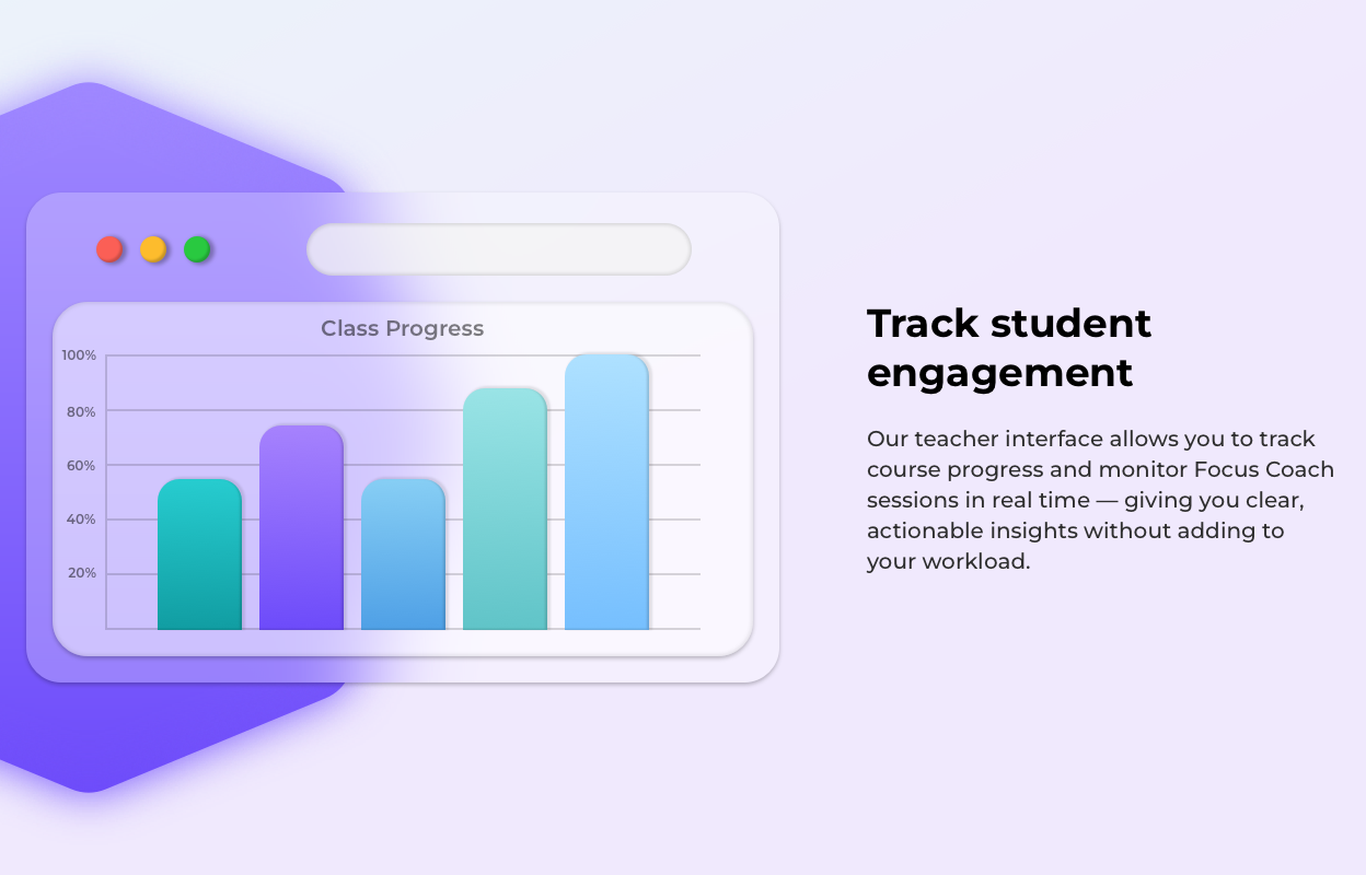 One of the biggest problems with the original landing page was that it described Finding Focus without really going over the full product offering. I decided to show off the different offerings Finding Focus has by creating abstracted versions of the interface. These assets helped make the product easier to understand at a glance by showing the core parts of the platform in a way that felt clear, cohesive with the rest of the page, and easy to scan.