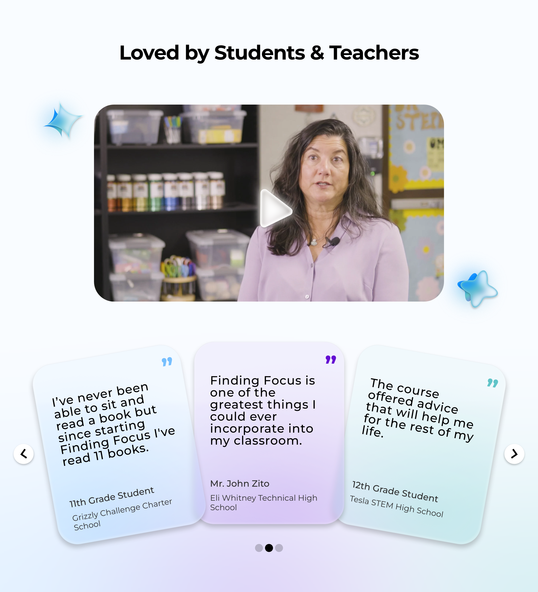 Testimonials were one of the clearest missing pieces from the original landing page. Bringing in real perspectives from both teachers and students helped make Finding Focus feel more credible, more human, and more proven in practice — all important for getting teachers to sign up.